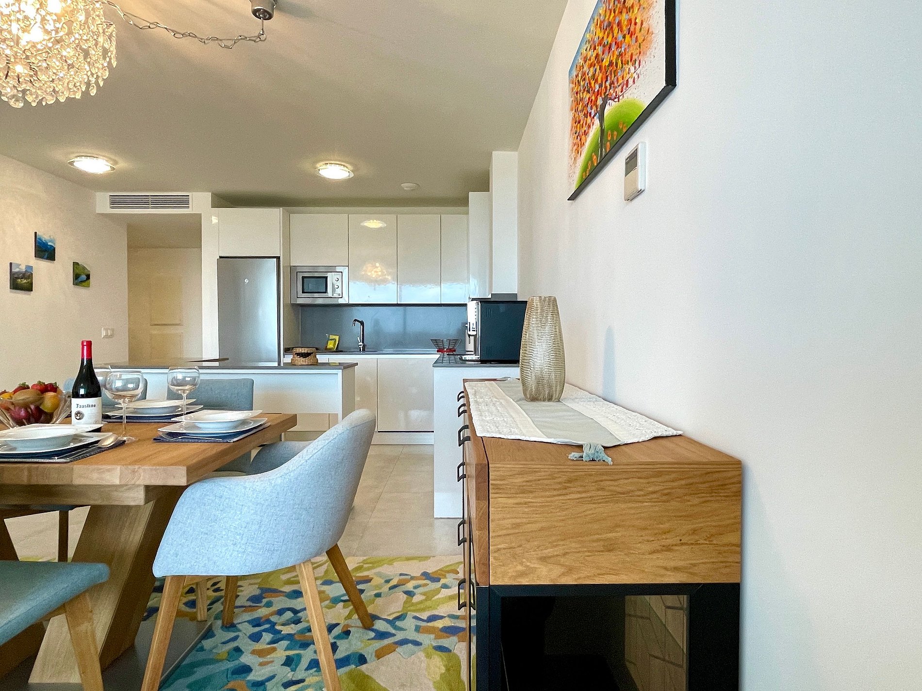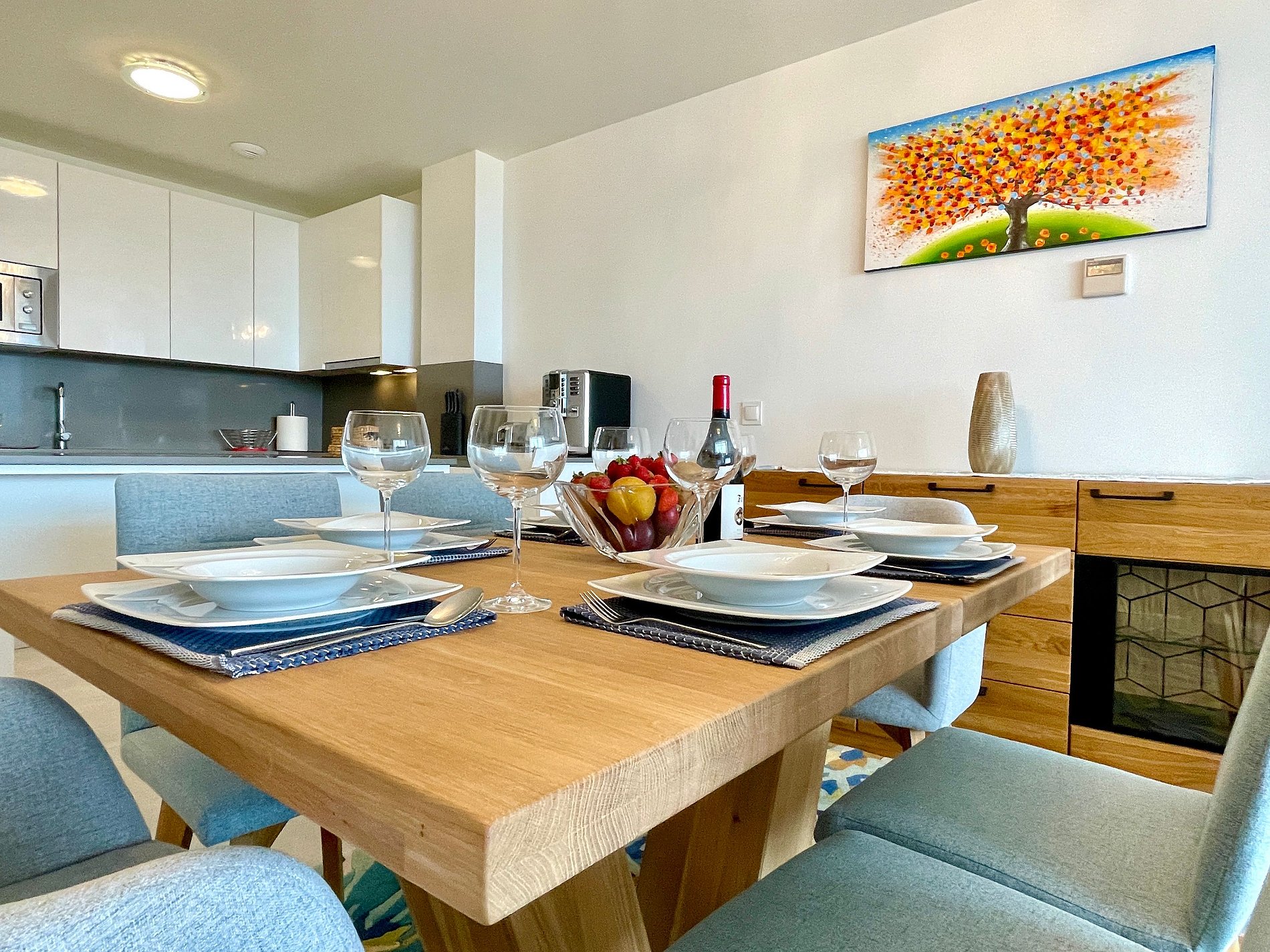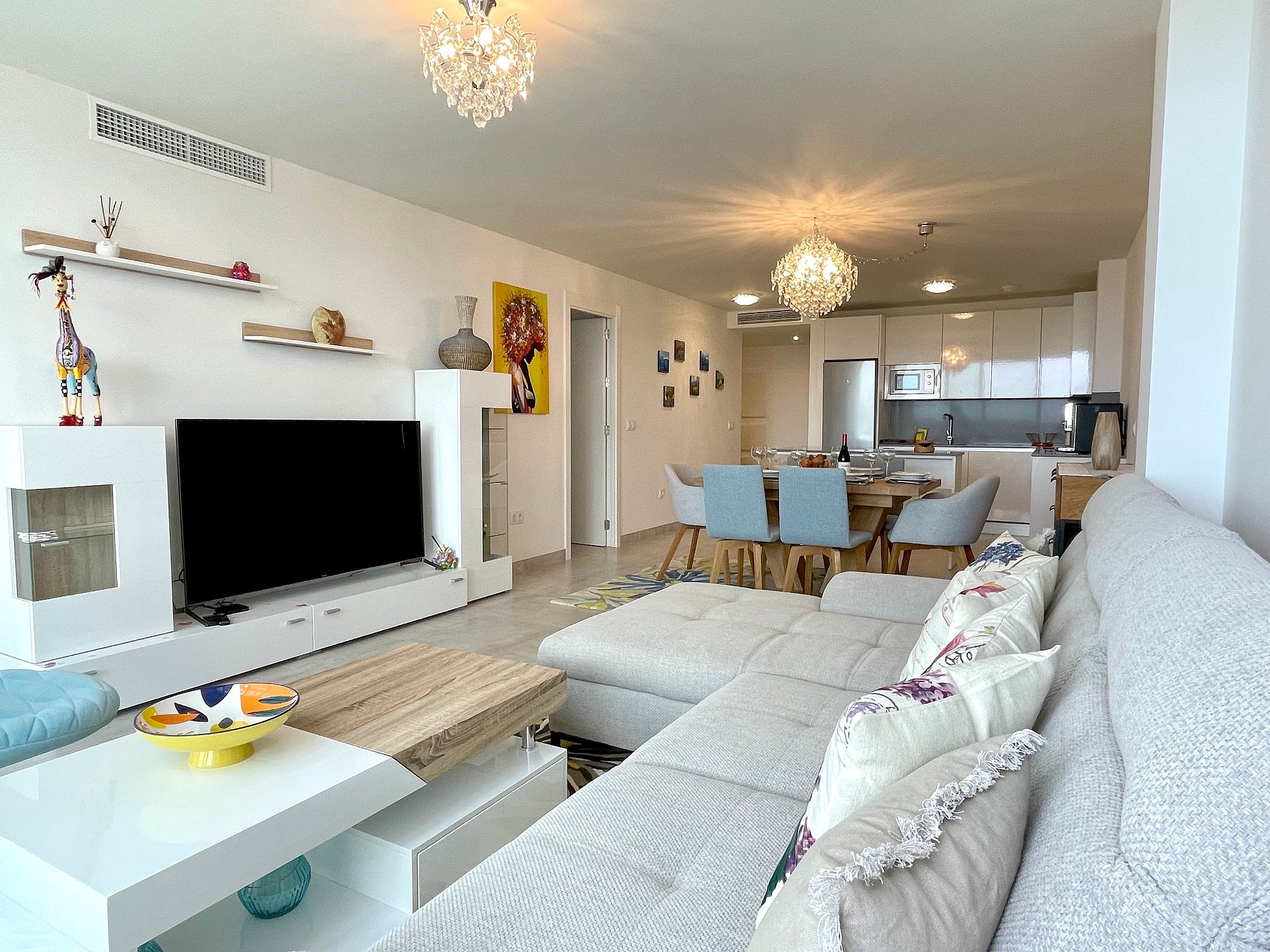 Una excelente casa de vacaciones con vista al mar desde la terraza privada, apartamento de 3 dormitorios diseñado con buen gusto para hasta 6 personas. Casa de vacaciones totalmente equipada. Características en la comunidad Casa Banderas: i, Pista de Padel, Gimnasio y parrillas comunitarias.