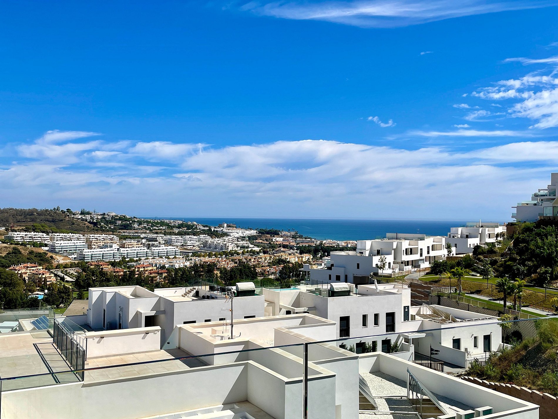 Una casa de vacaciones diseñada con buen gusto con acceso a la terraza desde el dormitorio principal y la sala de estar. Vistas al mar y montaña, así como vistas al pueblo de La Cala de Mijas.