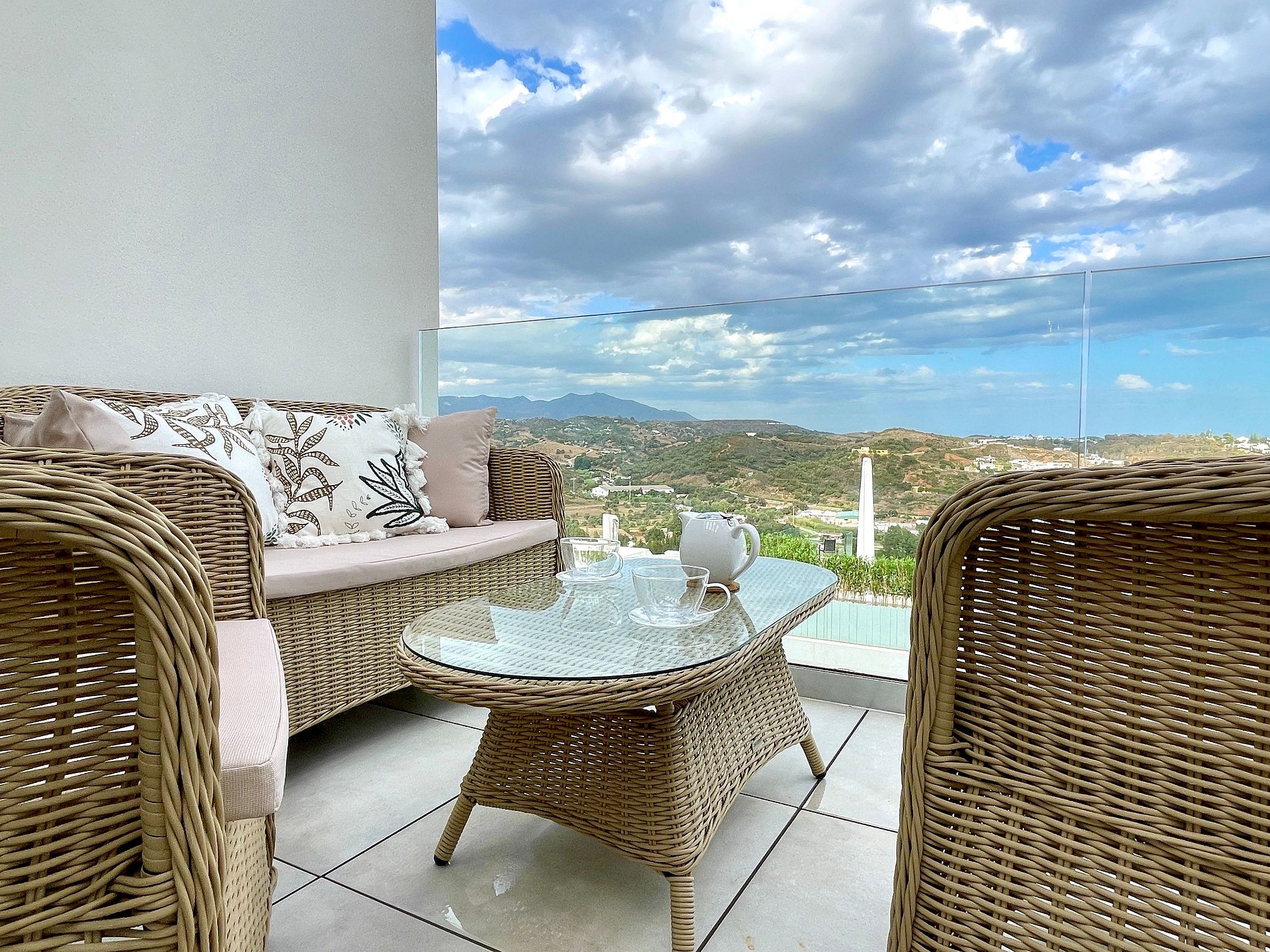 We had wonderful holiday in this great apartment with stunning views from a beautiful balcony equipped with comfortable furniture. The apartment was very spacious with 6 adults staying. The nearest pool is just up some steps outside, perfect to nip back indoors. We are glad we rented a car (paid €170 from Malaga cars for the week) as the complex is up a very steep hill, only a 15 minute walk down to town but is hard to walk back up in high temperatures and there are no shops at the top near the apartment . We would definitely book again.